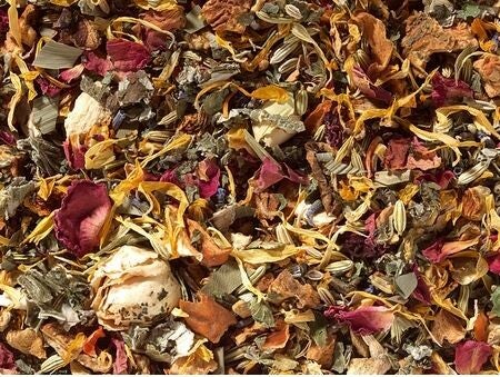 Appel, venkel, Chinees bamboeblad, gember, sinaasappelschil, wortel, kaneel, zwarte bes blad, eucalyptus blad, zwarte peperkorrels, rozenblaadjes, witte rozenknopjes, basilicum, framboosblad, lavendelbloesem, goudsbloem, rode biet