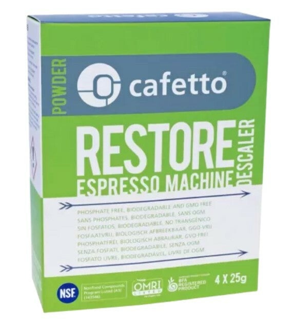 Restore kan gebruikt worden voor het ontkalken van espressomachines, koffiezetapparaten en waterketels/kokers. Een verpakking bevat 4 zakjes met 25gr ontkalker. Elk zakje kan worden opgelost in 1 liter water.